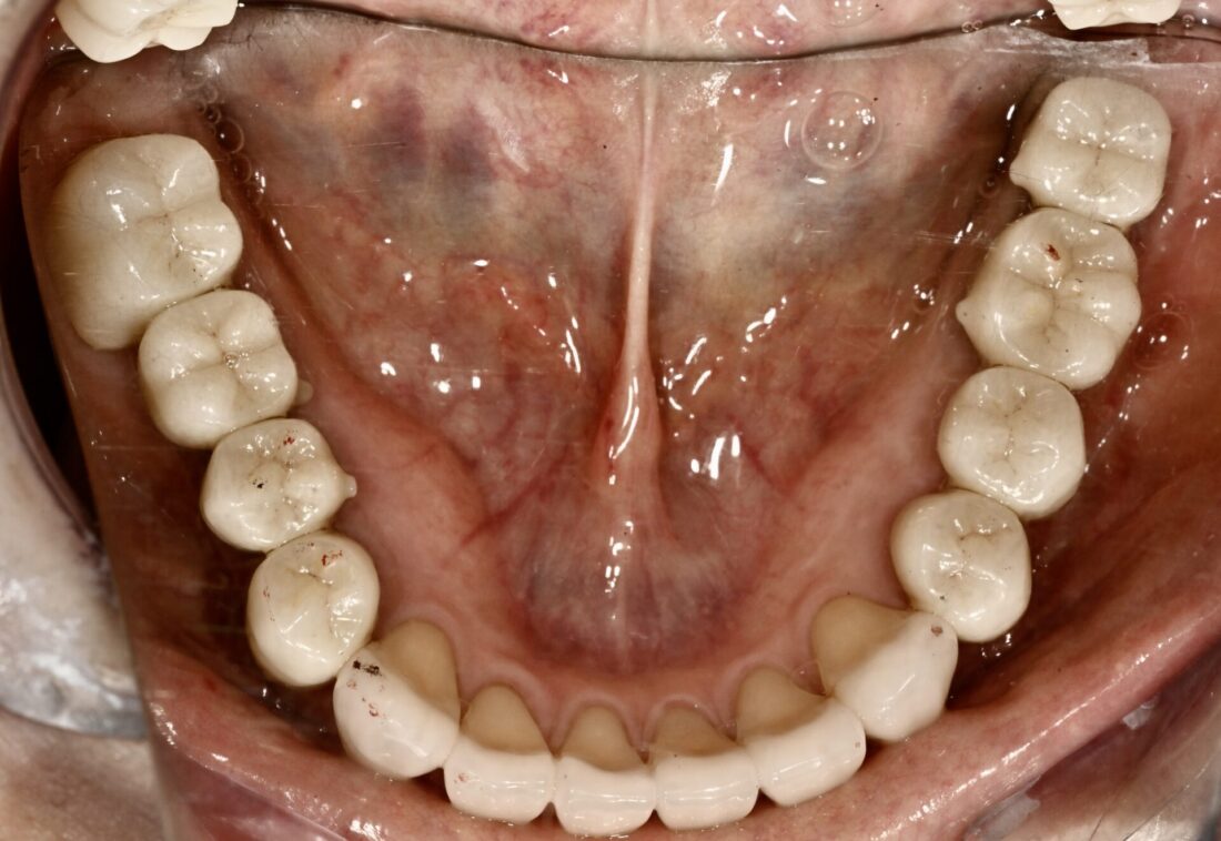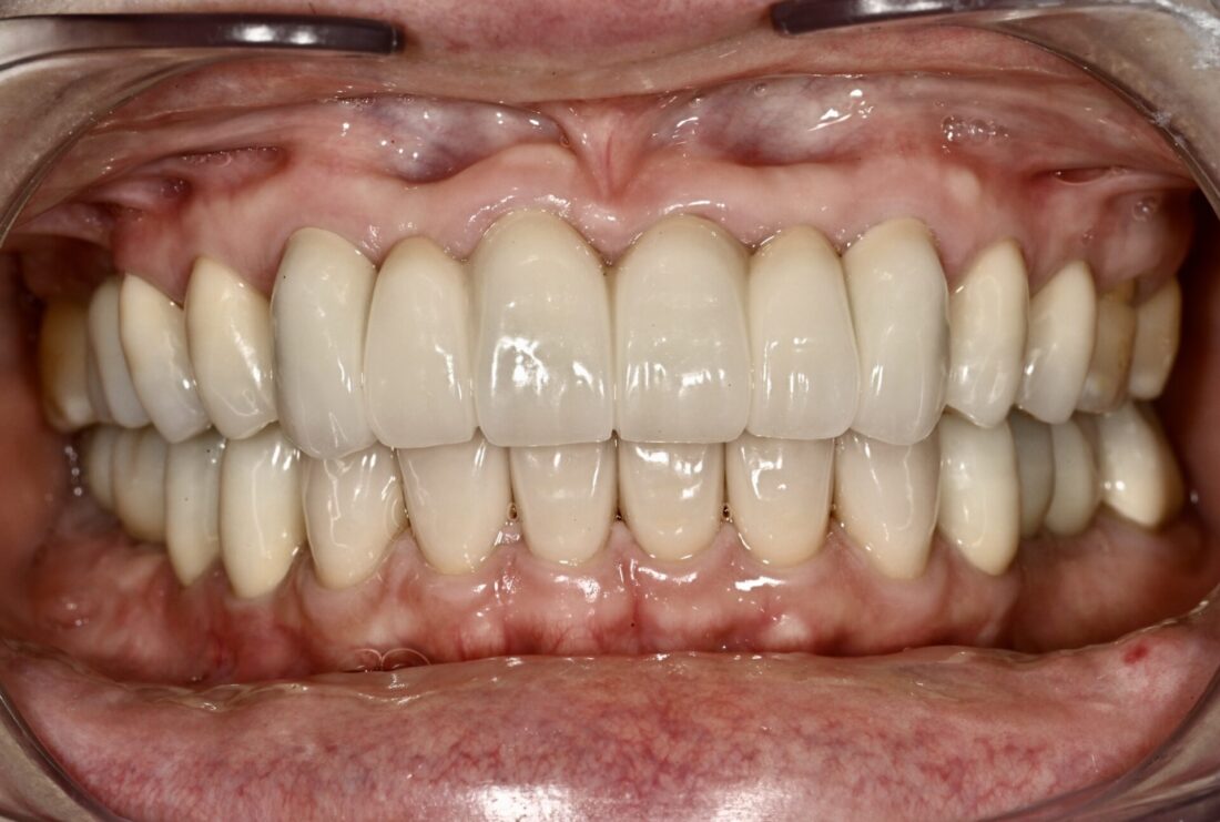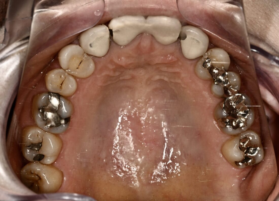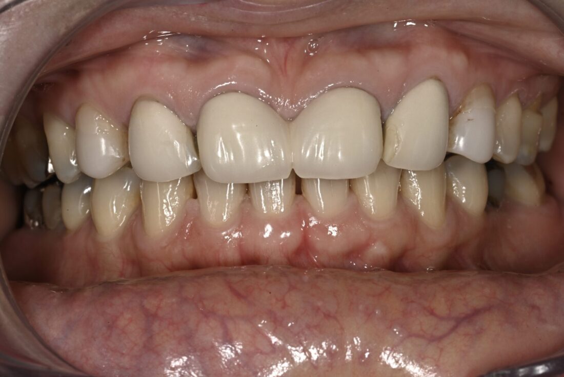 「セラミック矯正」なる専門用語は存在しません。強いていうなら補綴的(被せるもの)に歯牙の位置をかえ、審美的要求を達成することと言えるでしょうが、そのために無理に歯牙を削ったり、抜歯したりするようなことが多々行われているようです。また、本ケースもそうですが治療精度が著しく低く、治療というより破壊しているようなケースに多々遭遇します。適合の悪い、咬合が獲得できていない補綴物は短期間で問題発生します。また、前医は前歯の事しか頭にないのか、他分野の問題を認識し、それを解決する能力がないのか、非常にお粗末としか言えませんが、このようなケースはいっぱいあります。患者さん側の問題として、歯牙を抜歯、削ることを安易に考えている、後先のこと考えずとにかく前歯の見た目だけ改善すればいいとういうような考えの方がおられるのも事実です。セラミック矯正」を紹介する動画サイトを見ると、まるで便器のような真っ白なセラミックが入って喜んでいる患者がいますが、専門的に見ると明らかにおかしい、他のボロボロの歯牙はどうするの?というような場面をよく